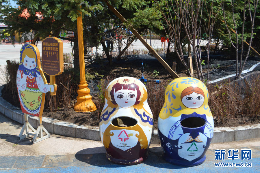 滿(mǎn)洲里市套娃景區(qū),連垃圾箱也是套娃模樣(6月23日)。新華網(wǎng)記者 張敏彥 攝