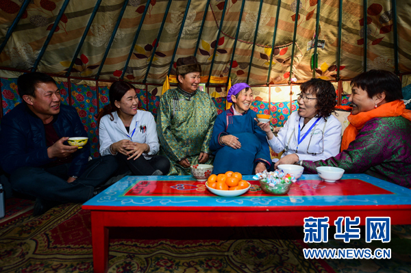 家庭責任醫(yī)務(wù)人員與阿巴嘎旗牧民道力格爾瑪一家拉家常(2月20日攝)。為緩解牧民看病難問題,從2013年起,阿巴嘎旗給超出衛(wèi)生院服務(wù)半徑10公里的每戶牧民配備小藥箱,安排家庭責任醫(yī)生,還購買了12臺內(nèi)置B超機、心電圖機、尿液分析儀等醫(yī)療設(shè)備的流動服務(wù)車。新華社記者 連振 攝