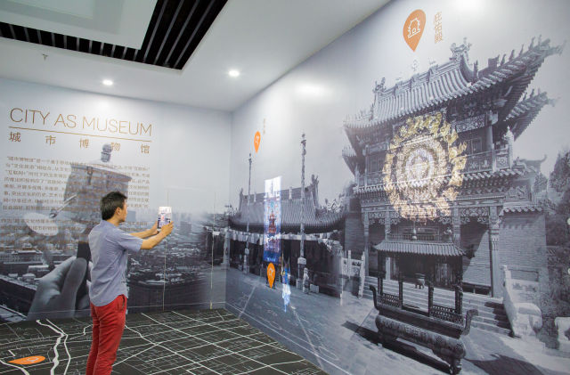 8月1日,呼和浩特玉泉區(qū)大數(shù)據(jù)應(yīng)用產(chǎn)業(yè)基地的工作人員通過平板設(shè)備展示城市博物館AR體驗(yàn)墻。新華社發(fā) 丁根厚 攝