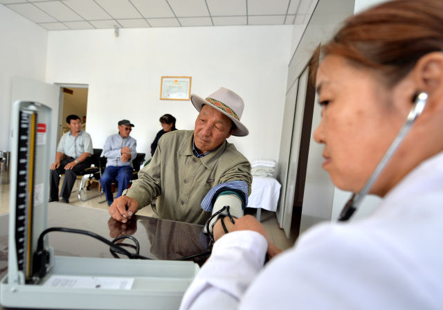 7月5日,60歲的牧民哈斯朝魯在阿巴嘎旗“哈樂穆吉”養(yǎng)老中心測(cè)量血壓。新華社記者 任軍川 攝