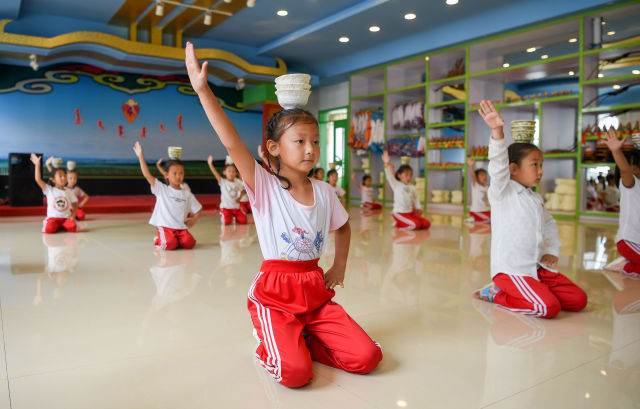 7月4日,達(dá)爾罕茂明安聯(lián)合旗蒙古族幼兒園的孩子正在練習(xí)蒙古族特色舞蹈。新華社記者 連振 攝