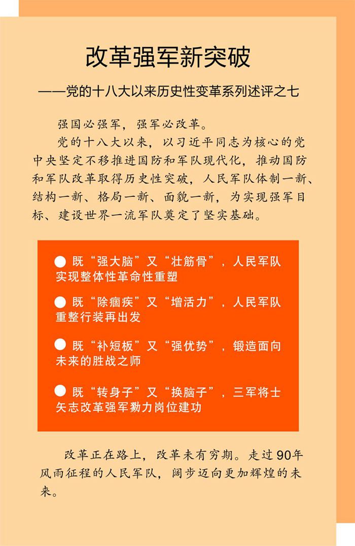 改革正在路上,改革未有窮期。走過90年風(fēng)雨征程的人民軍隊(duì),闊步邁向更加輝煌的未來。
