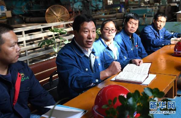 這是耿家盛(左二)在向工友們介紹參加十九大的感受(11月1日攝)。新華社記者 藺以光 攝