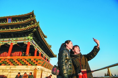 昨天天氣晴朗,在景山萬春亭,游客飽覽京城風景,愉快留影。實習記者 武亦彬攝
