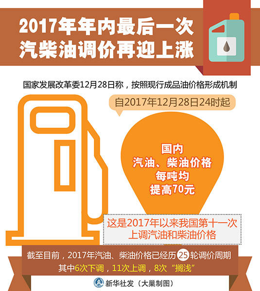 圖表:2017年年內(nèi)最后一次汽柴油調(diào)價再迎上漲 新華社發(fā) 大巢制圖