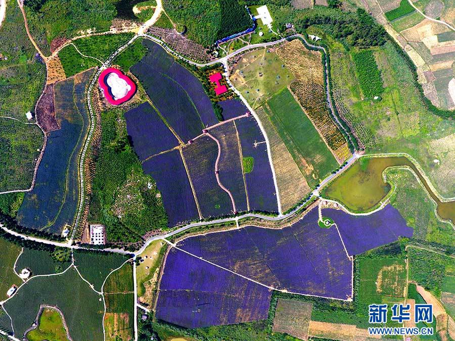這是5月26日航拍的廣西忻城縣薰衣草莊園。通過農(nóng)業(yè)、文化、旅游的深度融合,從農(nóng)業(yè)供給側(cè)改革上精準(zhǔn)發(fā)力,忻城走出了一條以農(nóng)業(yè)產(chǎn)業(yè)創(chuàng)新帶動(dòng)第三產(chǎn)業(yè)發(fā)展的道路。新華社記者 黃孝邦 攝