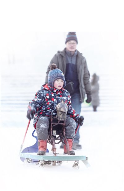 小熙在玩冰上爬犁。鄭鎣卓攝