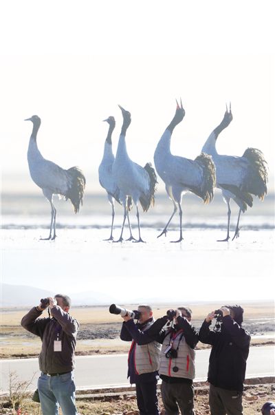 上圖:黑頸鶴。下圖:觀鳥(niǎo)者。 陳 飛攝
