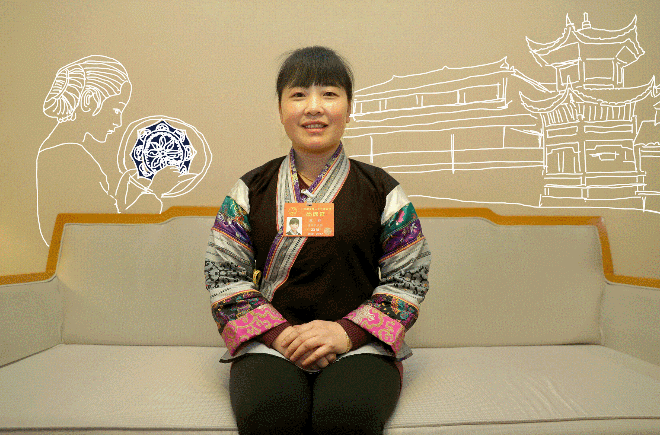??? ——全國人大代表蔡群在老家貴州畢節(jié)織金縣官寨鄉(xiāng)大寨村苗寨開了一家苗族蠟染刺繡公司,帶動寨子里300多名外出打工的婦女一起回鄉(xiāng)創(chuàng)業(yè)。