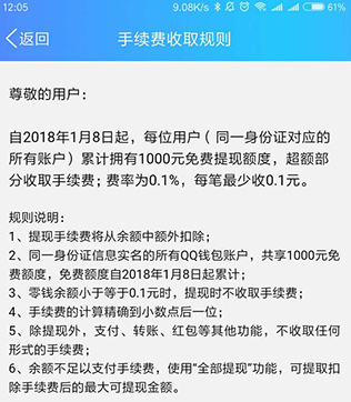 記者從騰訊QQ獲悉,自2018年1月8日起,QQ錢包每位用戶(同一身份證對應的所有賬戶)累積擁有1000元免費提現(xiàn)額度,超額部分收取手續(xù)費,費率為0.1%,每筆最少收0.1元。該收費標準與微信支付規(guī)則相同。另外,除提現(xiàn)外,支付、轉賬、紅包等其他功能,不收取任何形式的手續(xù)費。
