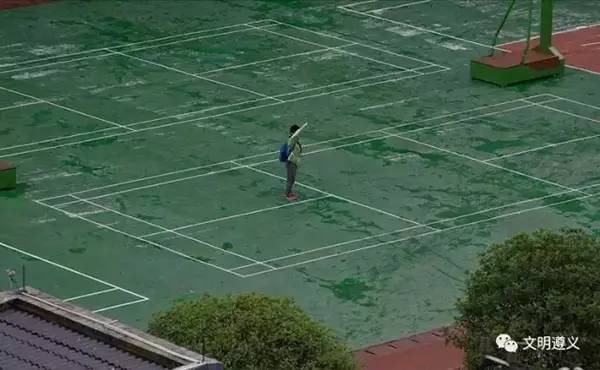 當(dāng)他跑到操場時(shí),突然聽到國歌聲響起,他立刻佇立風(fēng)雨中面向國旗敬禮。