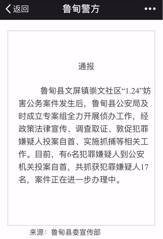 1月26日,云南昭通魯?shù)榭h委宣傳部就“不法者圍攻干警”一事通報(bào)稱,目前有6名犯罪嫌疑人已到公安機(jī)關(guān)投案自首,共抓獲犯罪嫌疑人17名,案件正在進(jìn)一步辦理中。