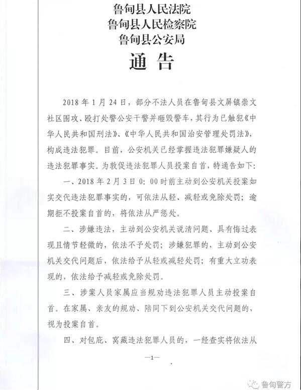 與此同時(shí),魯?shù)榭h公安局、法院、檢察院聯(lián)合發(fā)出通告稱,部分不法人員在魯?shù)榭h文屏鎮(zhèn)崇文社區(qū)圍攻、毆打處警公安干警并砸毀警車,其行為已觸犯《中華人民共和國(guó)刑法》、《中華人民共和國(guó)治安管理處罰法》,構(gòu)成違法犯罪,公安機(jī)關(guān)已經(jīng)掌握違法犯罪嫌疑人的違法犯罪事實(shí),限期在2月3日凌晨0點(diǎn)前主動(dòng)到公安機(jī)關(guān)投案自首、交代違法犯罪事實(shí),可依法從輕、減輕或免除處罰,逾期拒不投案自首的,將依法嚴(yán)懲。
