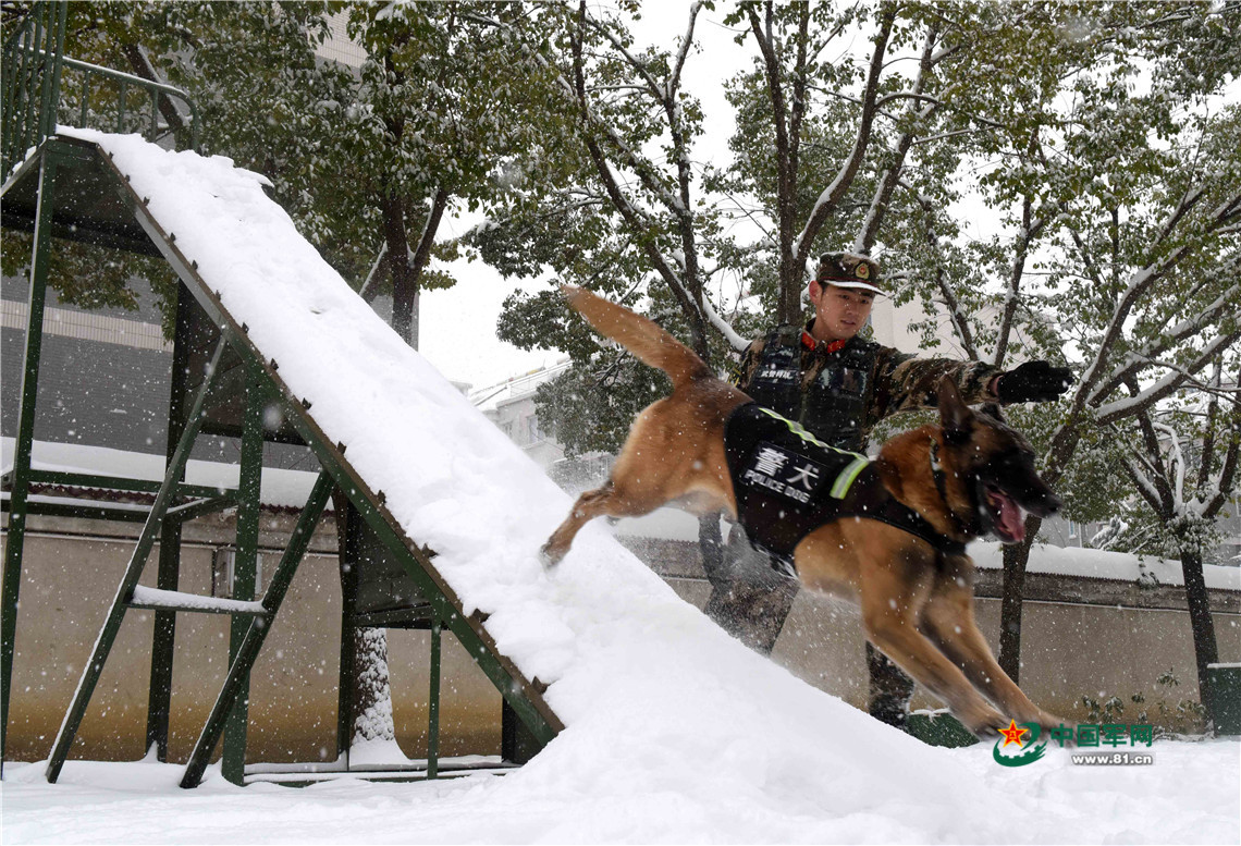 1月27日,武警安徽總隊(duì)機(jī)動(dòng)支隊(duì)警犬班班長(zhǎng)王營(yíng)廣帶領(lǐng)警犬“魯克”通過(guò)障礙。