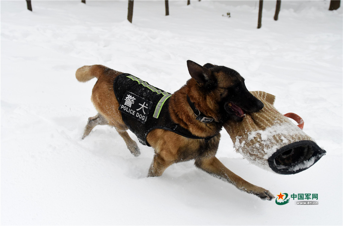 1月27日,武警安徽總隊(duì)機(jī)動(dòng)支隊(duì)警犬班班長(zhǎng)王營(yíng)廣帶領(lǐng)警犬“魯克”進(jìn)行搜尋訓(xùn)練。