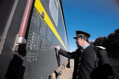 昨日,北京西車(chē)務(wù)段101站,57歲的值班員趙志剛在臨客車(chē)廂上做巡視記錄。記者 朱駿 攝