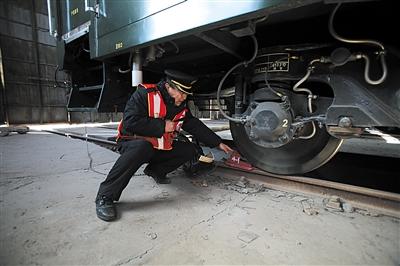 昨日,趙志剛給臨客車(chē)廂固定鐵鞋,防止車(chē)輛溜逸。