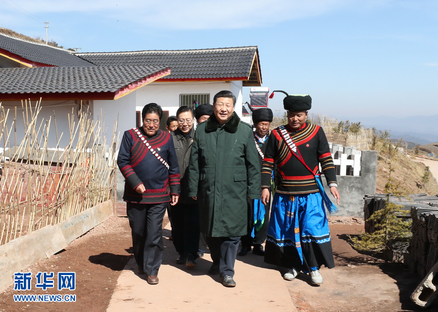 這是2月11日上午,習近平在涼山彝族自治州昭覺縣解放鄉(xiāng)火普村了解易地扶貧搬遷和彝家新寨建設情況。 新華社記者 鞠鵬 攝