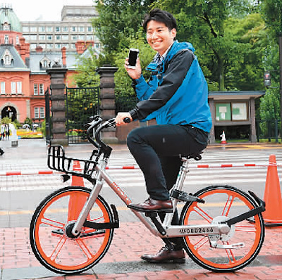 2017年8月22日,在日本北海道札幌市,一名當(dāng)?shù)赜脩粼囼T摩拜單車。新華社記者 華義 攝
