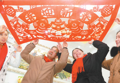 圖二 2月15日,在安徽省阜陽(yáng)市臨泉路白衣橋安置區(qū)內(nèi),安置戶董杰珍(前一)和當(dāng)?shù)丶艏埶囆g(shù)家一起將喜慶窗花張貼到窗戶上。王彪 攝(人民視覺)
