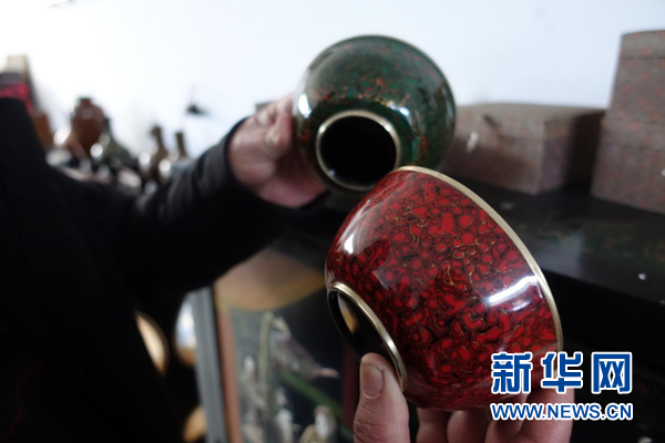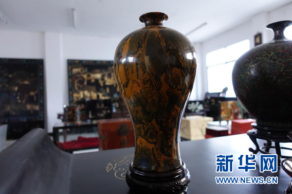 “流淌漆”技藝制作的花瓶?!傲魈势帷奔赐ㄟ^變換液態(tài)漆的濕度及流下的角度,使之形成自然的漆面花紋。新華網(wǎng) 卓越 攝