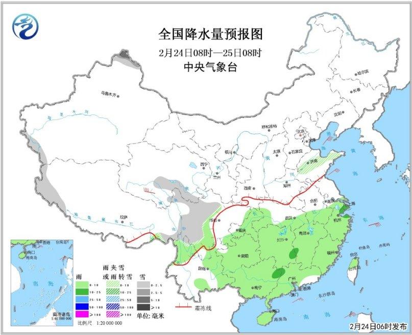 24日08時至25日08時,新疆北部、西藏西部、川西高原、青海東南部、山東北部等地有小到中雪或雨夾雪,局地大雪;云南東部、江漢南部、江南大部、華南大部等地有小雨,局地中雨。華北南部、黃淮、江漢東部、江淮北部等地及環(huán)渤海地區(qū)有4~6級風(fēng)。黃海中部、東海北部等海域?qū)⒂?~7級、陣風(fēng)8級的東北風(fēng)。