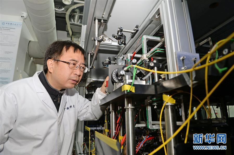 中國“墨子號”量子科學(xué)實(shí)驗(yàn)衛(wèi)星首席科學(xué)家潘建偉院士在中國科大量子存儲實(shí)驗(yàn)室內(nèi)了解科研情況(2017年4月20日攝)。新華社發(fā)(張大崗 攝)