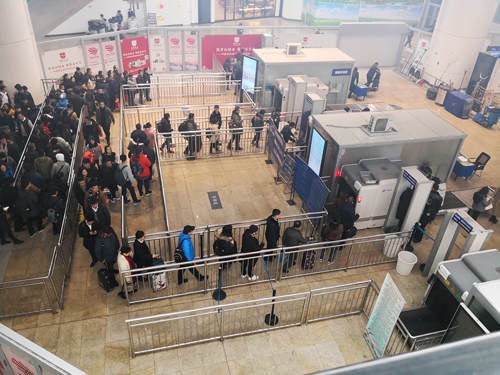 在一個(gè)火車站安檢口,排起的長(zhǎng)龍和閑置的安檢通道形成鮮明對(duì)比