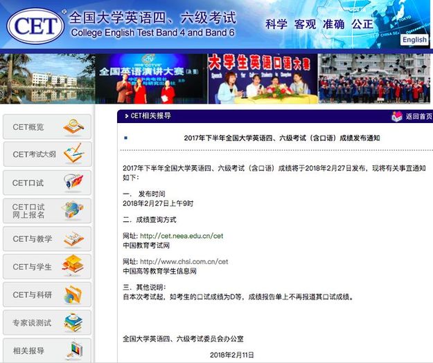 據(jù)全國大學(xué)英語四、六級(jí)考試委員會(huì)辦公室發(fā)布的通知,2017年下半年全國大學(xué)英語四、六級(jí)考試(含口語)成績今天發(fā)布!