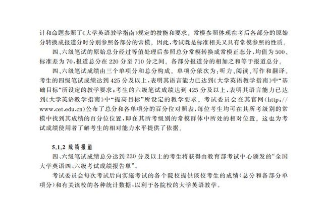 中國青年報(bào)(ID:zqbcyol)注意到,《全國大學(xué)生英語四、六級(jí)考試大綱》(2016修訂版)顯示,“考生的四級(jí)筆試成績達(dá)到425分及以上,表明其語言能力已達(dá)到《大學(xué)英語教學(xué)指南》中‘基礎(chǔ)目標(biāo)’所設(shè)定的教學(xué)要求;考生的六級(jí)筆試成績達(dá)到425分及以上,表明其語言能力已達(dá)到《大學(xué)英語教學(xué)指南》中‘提高目標(biāo)’所設(shè)定的教學(xué)要求?!?/p>