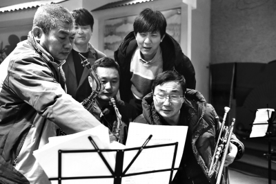 在馬莊村文化禮堂,農(nóng)民樂(lè)團(tuán)的成員在排練時(shí)討論樂(lè)譜。新華社發(fā)