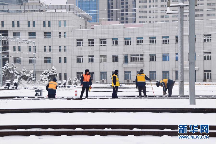 3月15日,沈陽北站的工作人員在清理鐵軌上的積雪。當(dāng)日,沈陽降落春雪。新華社發(fā)(龍雷攝)