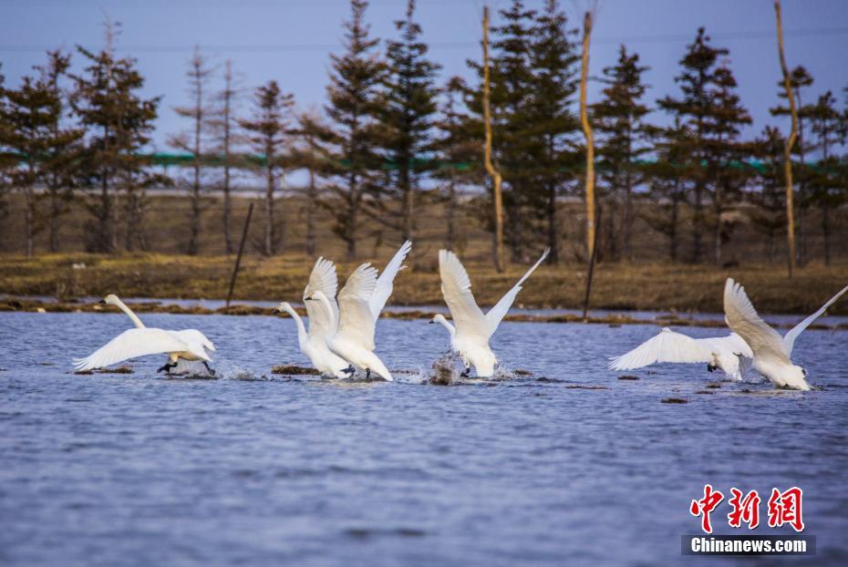 3月20日,天鵝在湖面上“舞蹈”。日前,內(nèi)蒙古自治區(qū)呼倫貝爾市陳巴爾虎旗陸續(xù)迎來大量北歸天鵝。據(jù)了解,每年四月份,成群的天鵝從中國南方遷徙到呼倫貝爾產(chǎn)卵繁殖,而今年三月中旬起,陳巴爾虎旗境內(nèi)便迎來大量回歸天鵝,實屬罕見。中新社記者 武軍 攝