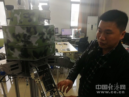 蔣剛介紹“龍騎士”機(jī)器人。經(jīng)濟(jì)日?qǐng)?bào)-中國經(jīng)濟(jì)網(wǎng)記者 佟明彪/攝