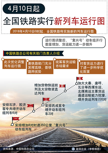 新華社北京4月2日電(記者齊中熙)記者從中國鐵路總公司獲悉,2018年4月10日0時起,全國鐵路將實施新的列車運行圖。運行圖調(diào)整后,“復(fù)興號”動車組開行數(shù)量增加,貨運能力進(jìn)一步提升。
