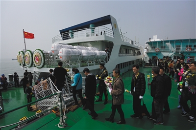 上午9時(shí)許,第一批從北京出發(fā)的骨灰撒海車隊(duì)抵達(dá)天津港國(guó)際郵輪母港碼頭,逝者親屬們相互攙扶,登上了客輪。在他們的身后,一起“登船”的是30多份逝者骨灰。黑底白字的“國(guó)賓9號(hào)”標(biāo)牌掛在船舷的醒目位置,船尾的甲板比正常客輪略大,二層欄桿上4個(gè)白色的花圈寫著“魂歸大?!?個(gè)字,讓整艘船顯得莊重。