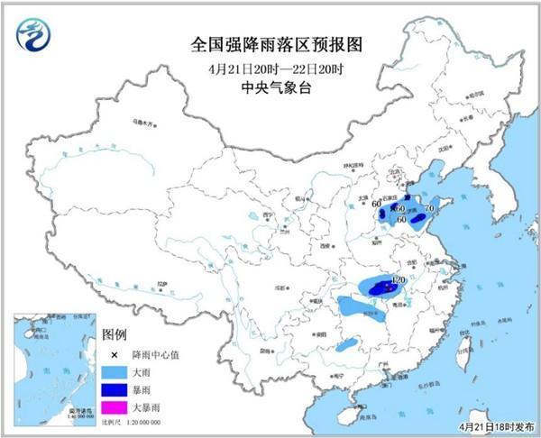預(yù)計(jì)4月21日20時(shí)至22日20時(shí),河北南部、山東中北部、湖北中東部、湖南北部、廣西北部等地的部分地區(qū)有大雨或暴雨,局地有大暴雨(100~120毫米),上述局地并將伴有短時(shí)強(qiáng)降水、雷暴大風(fēng)或冰雹等強(qiáng)對(duì)流天氣。