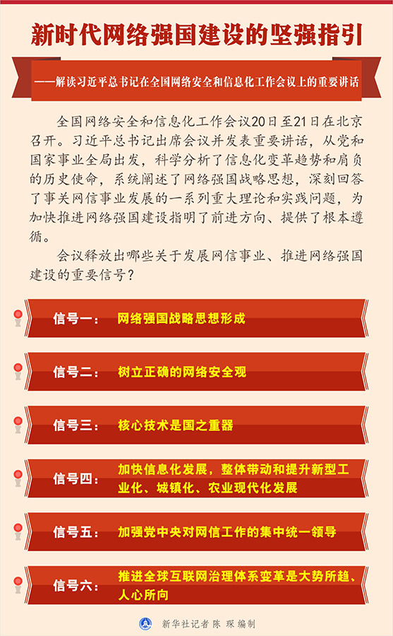 全國(guó)網(wǎng)絡(luò)安全和信息化工作會(huì)議20日至21日在北京召開。習(xí)近平總書記出席會(huì)議并發(fā)表重要講話,從黨和國(guó)家事業(yè)全局出發(fā),科學(xué)分析了信息化變革趨勢(shì)和肩負(fù)的歷史使命,系統(tǒng)闡述了網(wǎng)絡(luò)強(qiáng)國(guó)戰(zhàn)略思想,深刻回答了事關(guān)網(wǎng)信事業(yè)發(fā)展的一系列重大理論和實(shí)踐問題,為加快推進(jìn)網(wǎng)絡(luò)強(qiáng)國(guó)建設(shè)指明了前進(jìn)方向、提供了根本遵循。