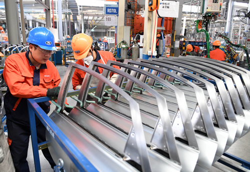 2018年3月27日,工人們?cè)谡憬R海的吉利汽車生產(chǎn)車間工作 殷博古 攝