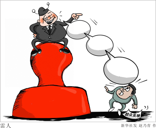 其二,遮丑關(guān)?!凹页蟛豢赏鈸P(yáng)”思維作祟,怕違法亂紀(jì)行為曝光影響地方形象而護(hù)短、包庇。在不少侵害群眾利益的行為中,一些政府部門或多或少充當(dāng)了幫兇。只要群眾忍氣吞聲,這些行為就不了了之。一旦群眾投訴引發(fā)輿論關(guān)注,當(dāng)?shù)卣ε缕毓庥绊懙胤叫蜗笊踔痢盀跫喢薄保团沙龈髀啡笋R“游說”。這些干部接待上訪群眾時(shí)先表示同情和理解,再以“大局意識(shí)”進(jìn)行說教,最終提出賠錢了事。一旦“說不通”,就“放狠話”“玩拖延”,甚至威脅。