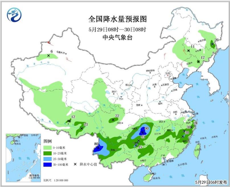 全國(guó)降水量預(yù)報(bào)圖(5月29日08時(shí)-30日08時(shí))