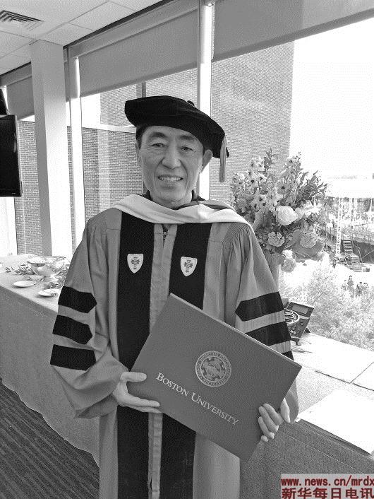 手持波士頓大學(xué)榮譽博士學(xué)位證書的張藝謀導(dǎo)演。攝影:本報記者 董丁