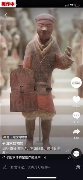 國博發(fā)布的短視頻中,“高冷”的陶男俑、陶女俑和說書俑在音樂中“跳起舞來”。手機APP截圖