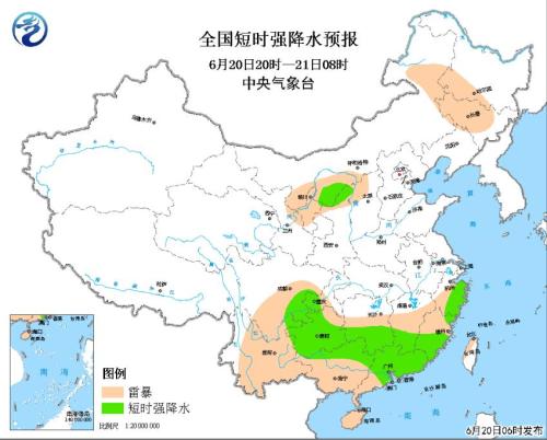預計6月20日08時到21日08時,貴州、湖南中南部、江西、浙江、福建、廣東中北部、海南東北部、云南西南部等地的部分地區(qū)將有短時強降水天氣,小時雨強20-50毫米,局地可達60毫米以上;另外,內蒙古中部和東部、吉林南部、遼寧東北部、浙江南部、福建北部和南部、廣東北部等地局地將有雷暴大風或冰雹天氣。