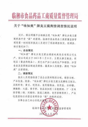 情況說明指出,近日,部分網(wǎng)媒平臺相繼出現(xiàn)“味知爽”牌長沙臭豆腐配料表中含“屎”的新聞,臨湘市食品藥品工商質(zhì)量監(jiān)督管理局第一時間組織執(zhí)法人員進(jìn)行了現(xiàn)場調(diào)查核實(shí)。