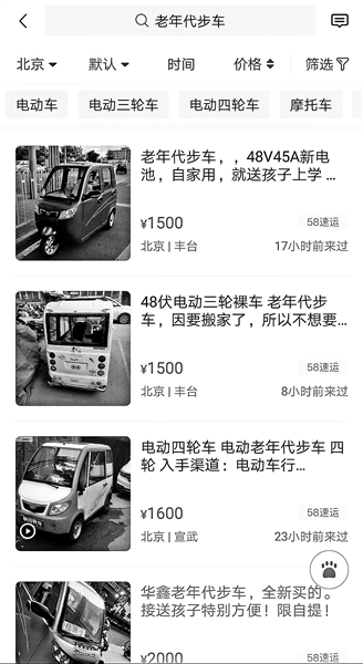 北青報記者在“閑魚”“轉(zhuǎn)轉(zhuǎn)”等二手貨交易平臺上鍵入“老年代步車”后,可以搜索上百條等待交易的信息,有大興、豐臺、順義、東城、朝陽等地車主發(fā)布的交易信息,“北京車主看車方便”,多為當面交易。