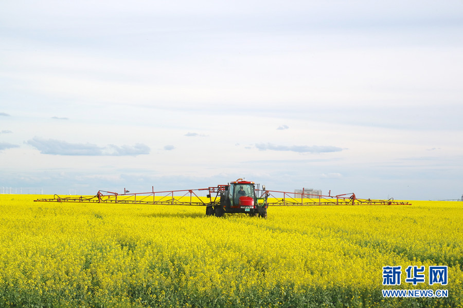 7月21日,一輛自走式噴藥機正在內(nèi)蒙古呼倫貝爾市謝爾塔拉農(nóng)場對油菜花進行追肥作業(yè)。(新華網(wǎng) 汪亞/攝)