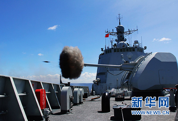 在多國(guó)聯(lián)演任務(wù)中,??谂炦M(jìn)行主炮射擊(2014年6月19日攝)。 新華社發(fā)(于林 攝)