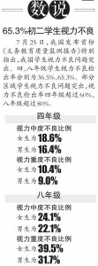 《義務(wù)教育質(zhì)量監(jiān)測報(bào)告》指出,學(xué)生視力不良問題突出,四年級(jí)、八年級(jí)學(xué)生視力不良檢出率分別為36.5%和65.3%。實(shí)際上,不僅僅只有報(bào)告中義務(wù)教育的學(xué)生存在視力問題,我國青少年視力的整體情況也十分不樂觀。根據(jù)世界衛(wèi)生組織的最新研究報(bào)告,目前中國近視患者人數(shù)多達(dá)6億。其中我國初高中生和大學(xué)生的近視率均已超過七成。我國青少年近視率已高居世界第一。相比之下,美國青少年的近視率約為25%,澳大利亞僅為1.3%,德國的近視率一直控制在15%以下。