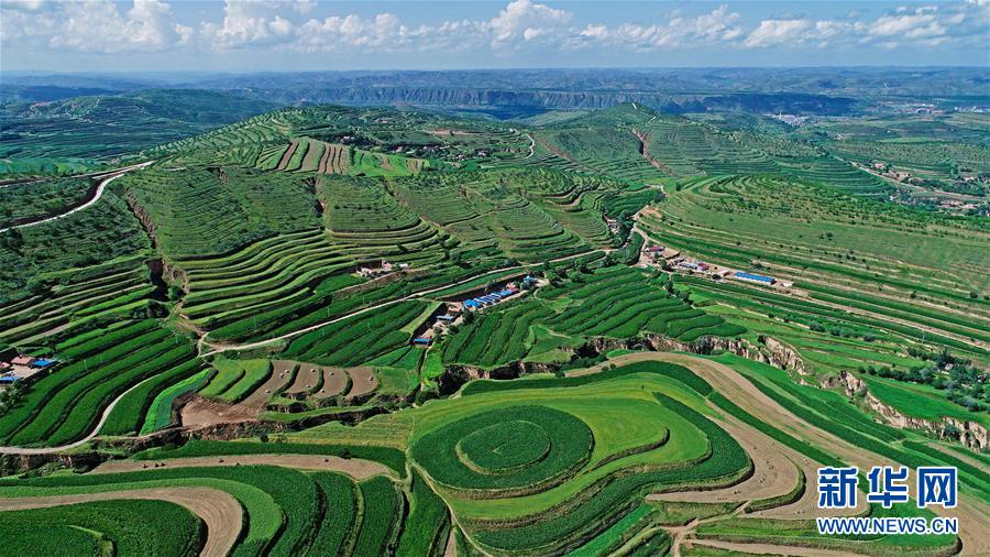 寧夏固原市彭陽(yáng)縣金雞坪梯田公園(7月16日無(wú)人機(jī)拍攝)。 新華社記者 王鵬 攝